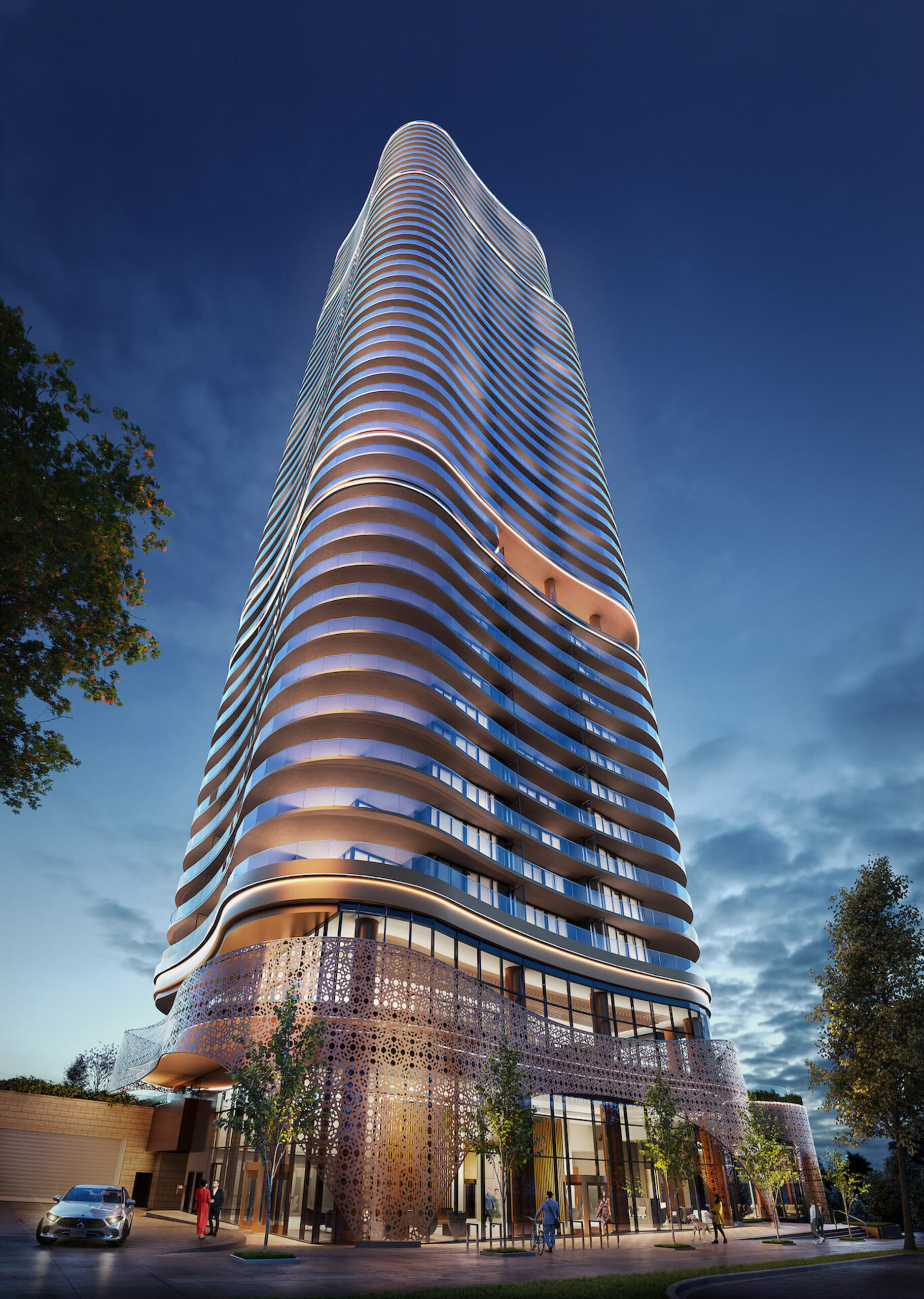 An arched filigree lattice anchors the tower, framing the grand entry. Expansive private outdoor sanctuaries follow the curvature of the tower’s silhouette. The gentility in design culminates in understated classic luxury.